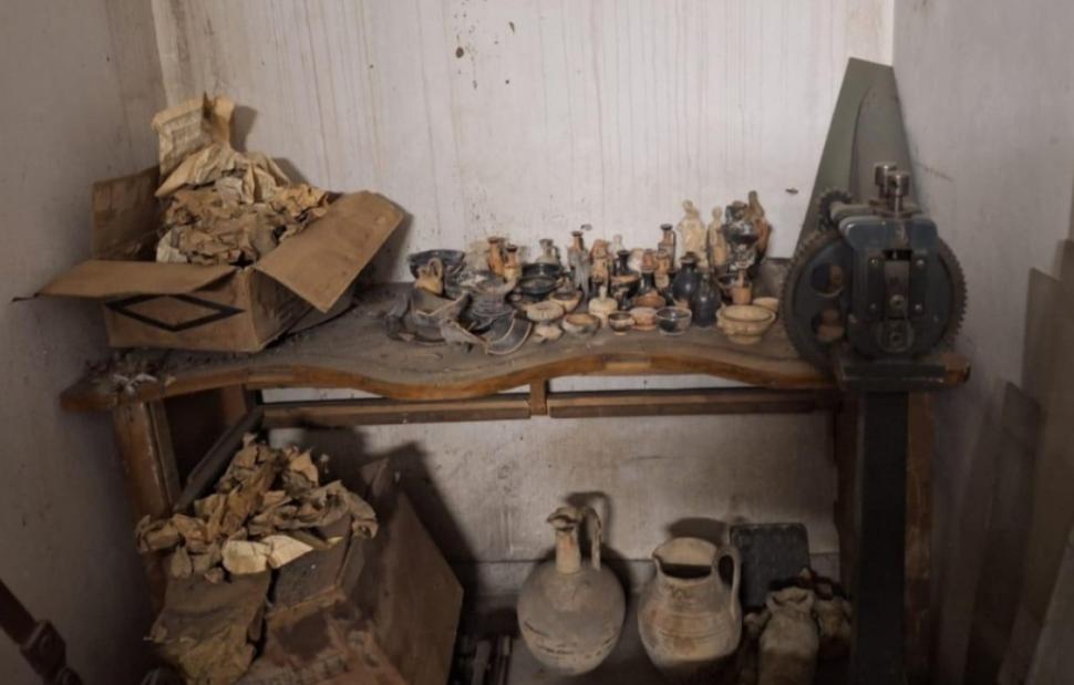 Το σύνολο σχεδόν των αρχαίων αντικειμένων εντοπίστηκε σε δυσπρόσιτο υπόγειο χώρο, προσβάσιμο από καταπακτή στο δάπεδο του ισογείου.