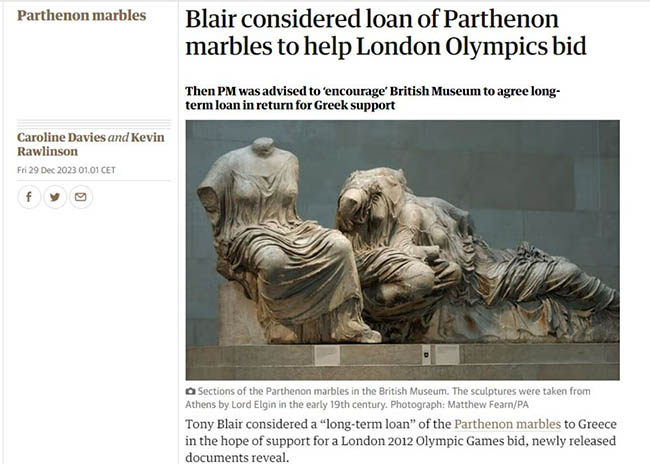 Στην αποκάλυψη ότι ο πρώην πρωθυπουργός της Βρετανίας, Τόνι Μπλερ, είχε εξετάσει το ενδεχόμενο ενός «μακροπρόθεσμου δανεισμού» των Γλυπτών του Παρθενώνα στην Ελλάδα με την ελπίδα η χώρα μας να υποστηρίξει την υποψηφιότητα του Λονδίνου για τους Ολυμπιακούς Αγώνες του 2012 προχωρά ο Guardian.