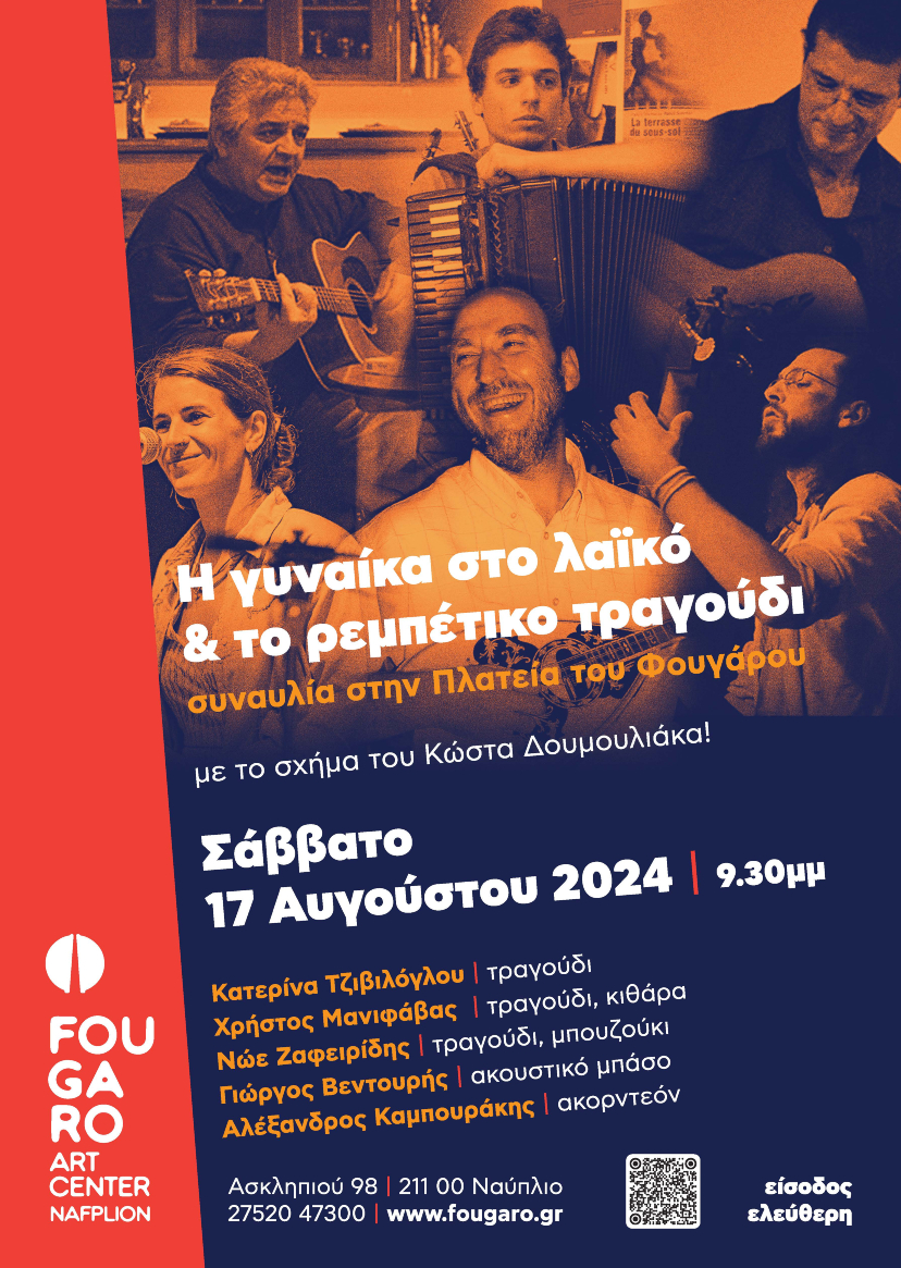 Το FOUGARO ARTCENTER υποδέχεται το Σάββατο 17 Αυγούστου στις 9.30μμ, τον Κώστα Δουμουλιάκα και 5 ακόμη μουσικούς σε μια συναυλία αφιερωμένη στη γυναίκα με τίτλο «Η γυναίκα στο λαϊκό και το ρεμπέτικο τραγούδι».