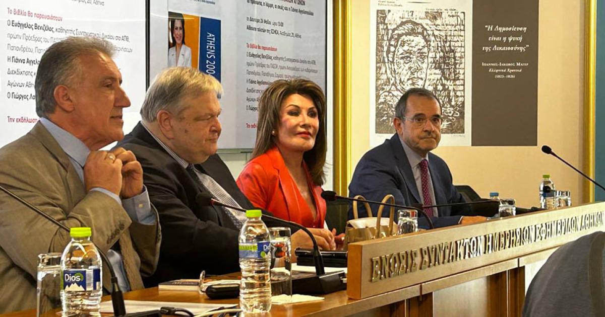 Το βιβλίο στο εξώφυλλο του έχει την Γιάννα Αγγελοπούλου, την τότε πρόεδρο της οργανωτικής επιτροπής, η οποία βρέθηκε στο πάνελ και μίλησε για τις δυσκολίες της ανάθεσης, αλλά και της διεξαγωγής των Ολυμπιακών Αγώνων. Παράλληλα, αναφέρθηκε και στην κληρονομιά που άφησε αυτή η εποχή στην Ελλαδα, αφήνοντας αιχμές όμως, για το γεγονός πως το Κράτος στη συνέχεια δεν εκμεταλλεύτηκε τα έργα που έγιναν.
