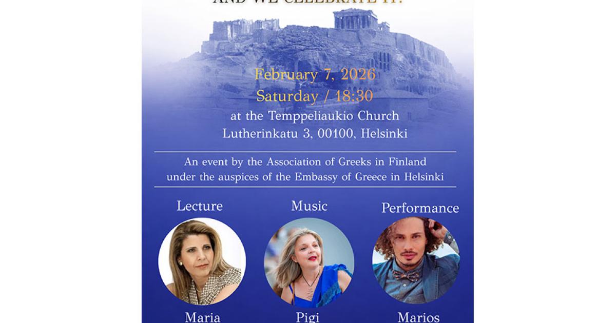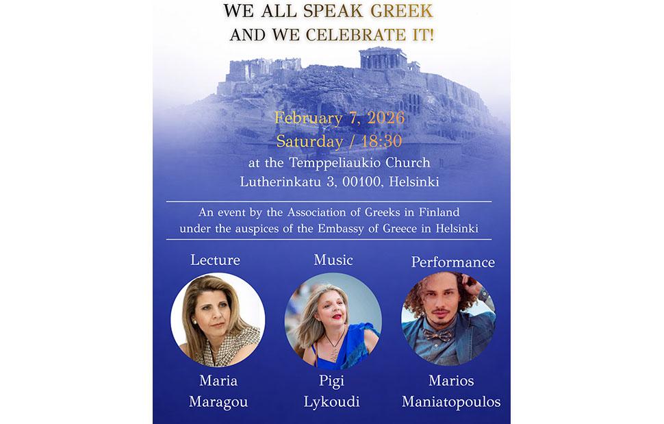 Δύο ημέρες εκδηλώσεων: την Παρασκευή 6 Φεβρουαρίου 2026, 15:30–17:00, στον Χώρο Εκδηλώσεων του Ευρωπαϊκού Σχολείου, οδός Bulevardi 18 και το Σάββατο 7 Φεβρουαρίου 2026, στις 18:30, στην Temppeliaukio Church (Church of the Rock), οδός Lutherinkatu 3, 00100, Ελσίνκι παρουσίᾳ της Ελληνίδας Πρέσβεως στη Φινλανδία, κ. Ναταλίας Μ. Καραγεώργου, η οποία τιμά την εκδήλωση, θα ανακαλύψουμε το βάθος και τον πλούτο του Ελληνικού Πνεύματος, βιώνοντας μελωδικά τα νοήματά του.