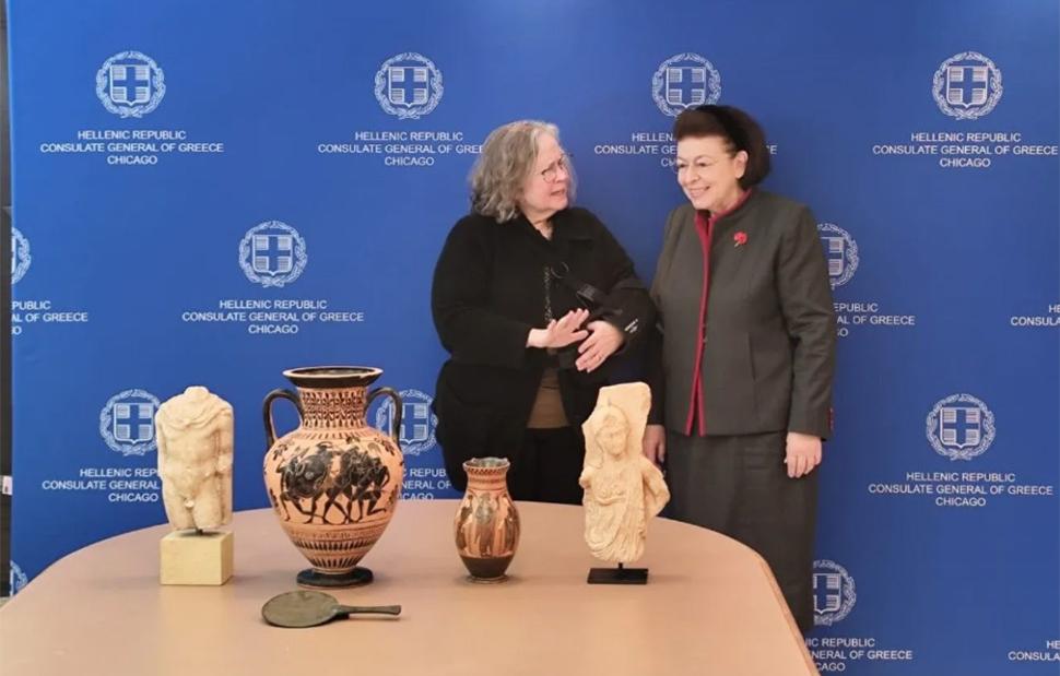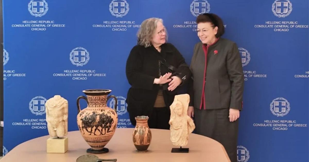 Η υπουργός Πολιτισμού Λίνα Μενδώνη παρέλαβε, σε ειδική τελετή, στο Γενικό Προξενείο της Ελλάδας, στο Σικάγο, πέντε αρχαιότητες, που επαναπατρίζονται από τις Ηνωμένες Πολιτείες. Πρόκειται για δύο μελανόμορφα αγγεία (αμφορέα και όλπη) αττικών εργαστηρίων του 6ου αιώνα π.Χ.