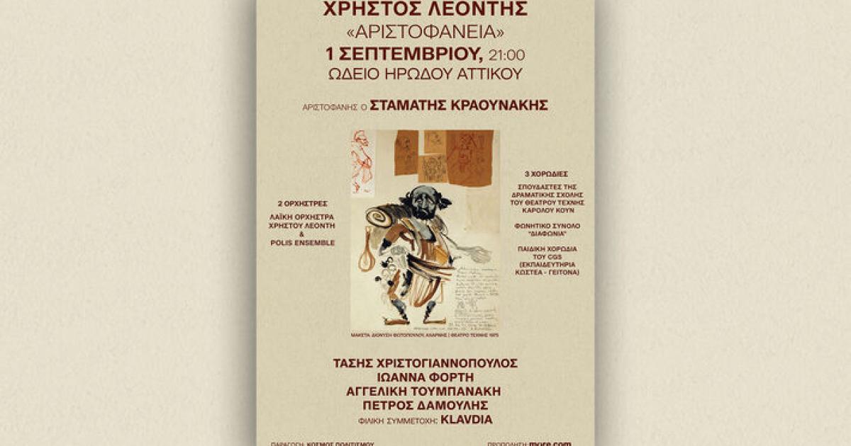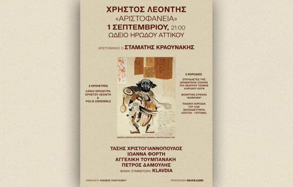 Tη μουσική παράσταση «Αριστοφάνεια» παρουσιάζει o Χρήστος Λεοντής τη Δευτέρα 1η Σεπτεμβρίου στο Ηρώδειο, με τον Σταμάτη Κραουνάκη στον ρόλο του Αριστοφάνη, σπουδαίους ερμηνευτές, ορχήστρες και χορωδίες.
