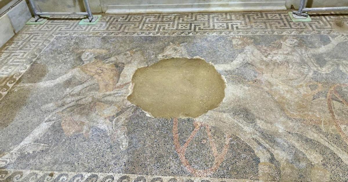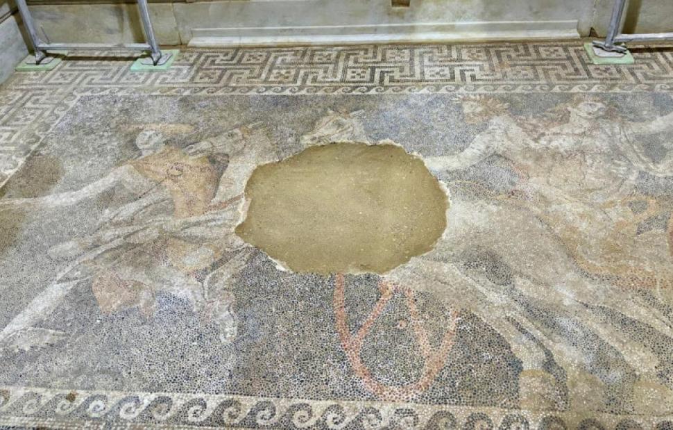 - Αφαιρέθηκαν τα ικριώματα από το χώρο με το ψηφιδωτό της Αρπαγής της Περσεφόνης και ολοκληρώνεται ο καθαρισμός του ψηφιδωτού.