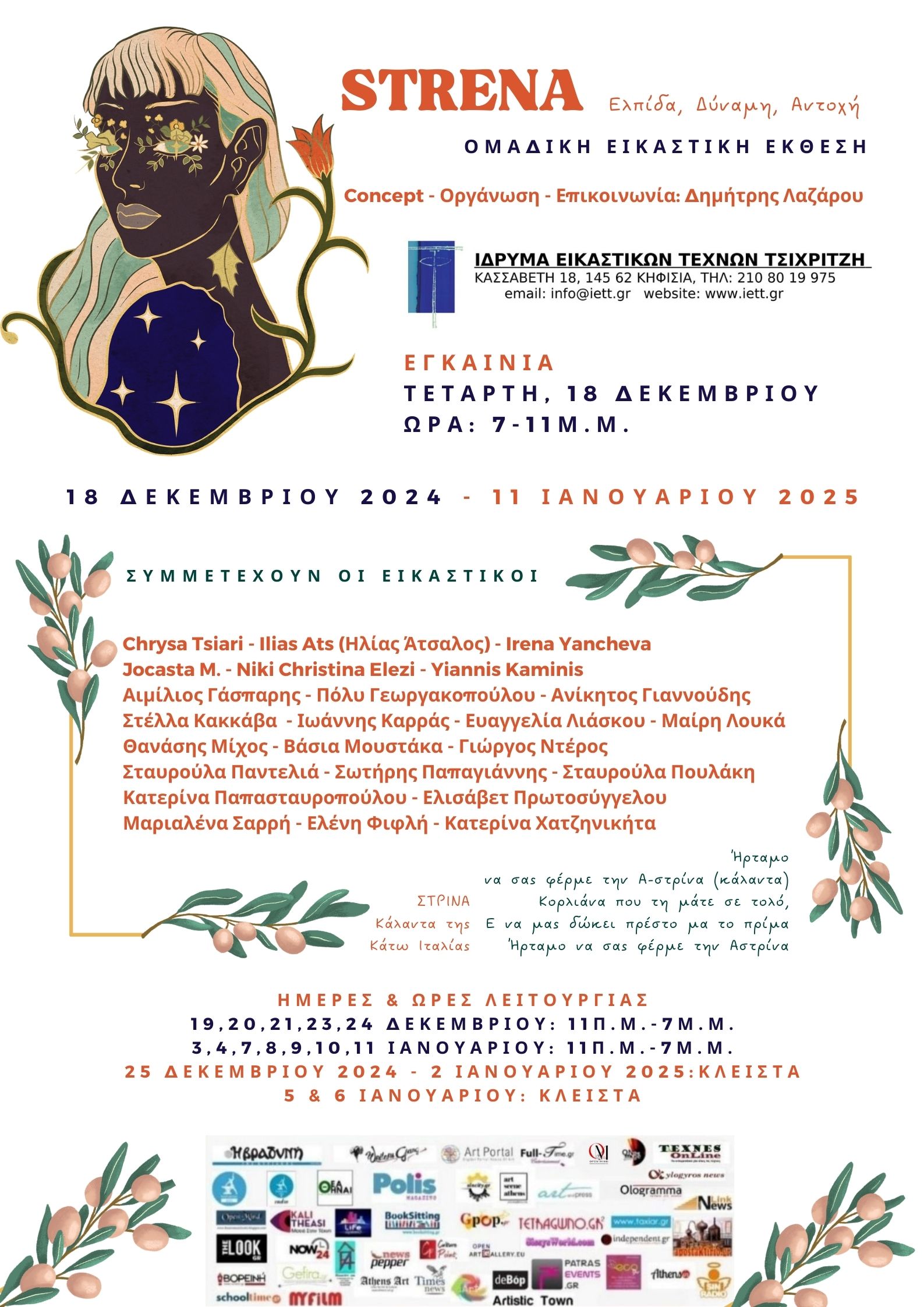 Στον εμβληματικό χώρο του Ιδρύματος Εικαστικών Τεχνών Τσιχριτζή, Κασσαβέτη 18, Κηφισιά, καλωσορίζουμε τη ΝΕΑ ΧΡΟΝΙΑ με την ομαδική εικαστική έκθεση «STRENA».
