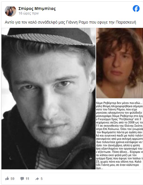 Από την πλευρά του, ο Σπύρος Μπιμπίλας αποχαιρέτησε τον Γιάννη Ράμο, γράφοντας την ερμηνεία του ηθοποιού στον ρόλο του δημοσιογράφου Χάιμε Ρεβέρτερ στο έργο του Γκιγιέρμο Έρας «Ροτβάιλερ» από το 2008 έως το 2011. «Βασανισμένος από μια σκληρή αρρώστια τα δύο τελευταία χρόνια κατάφερε να τη νικήσει τον Δεκέμβριο, αλλά η γρίπη βρήκε εξαντλημένο τον οργανισμό του και τον εξόντωσε», έγραψε ο πρόεδρος του ΣΕΗ.