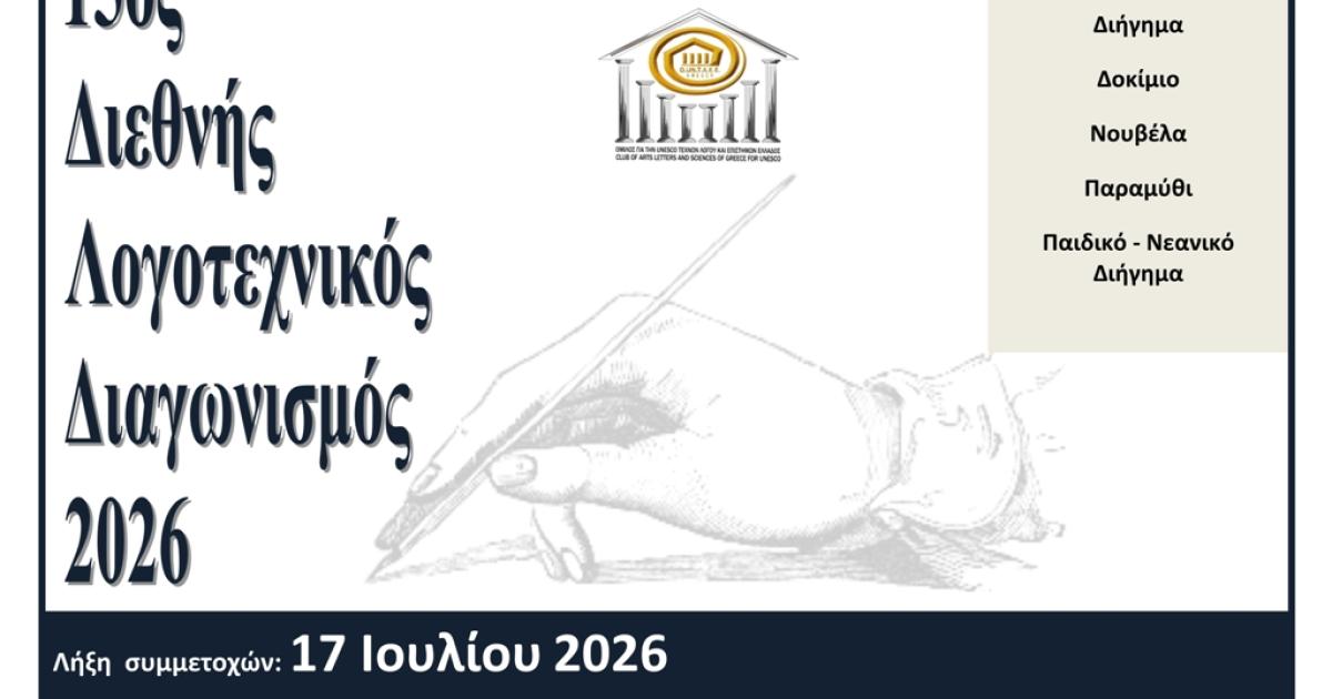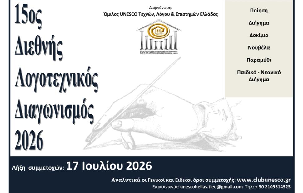 Ο Όμιλος UNESCO Τεχνών, Λόγου και Επιστημών Ελλάδος με ιδιαίτερη χαρά προκηρύσσει τον 15ο Διεθνή Λογοτεχνικό Διαγωνισμό 2026, με λήξη τη 17 η Ιουλίου 2026.
