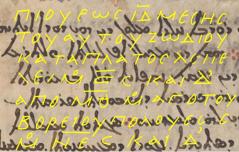 Αρχικά θεωρείτο ότι το αρχαιότερο αυτό κείμενο ήταν επίσης χριστιανικό. Όταν όμως το 2012 ο ειδικός σε βιβλικά κείμενα Πίτερ Ουίλιαμς του Πανεπιστημίου του Κέιμπριτζ ζήτησε από τους φοιτητές του να μελετήσουν τον Κώδικα, απρόσμενα εντοπίστηκε μια παράγραφος στα ελληνικά που αποδιδόταν σε έναν άλλο σημαντικό Έλληνα αστρονόμο, τον Ερατοσθένη. Το 2017 έγινε νέα ανάλυση με πιο σύγχρονη τεχνολογία πολυφασματικής απεικόνισης από Αμερικανούς ερευνητές, οι οποίοι φωτογράφησαν τις σελίδες της περγαμηνής σε διαφορετικά μήκη κύματος του φωτός και στη συνέχεια χρησιμοποίησαν υπολογιστικούς αλγόριθμους για να διαβάσουν το κρυμμένο από κάτω κείμενο.