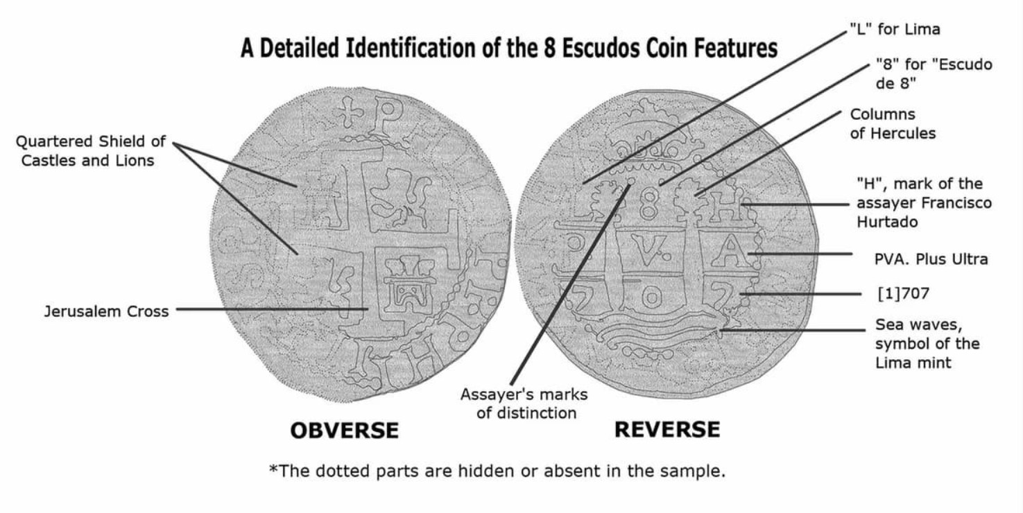 Τα νομίσματα φέρουν σύμβολα που μαρτυρούν πως, είχαν κοπεί το 1707, στο ισπανικό νομισματοκοπείο της Λίμα, ενώ επιπλέον φέρουν τις εραλδικές ασπίδες των στεμμάτων της Καστίλης και της Λεόν.