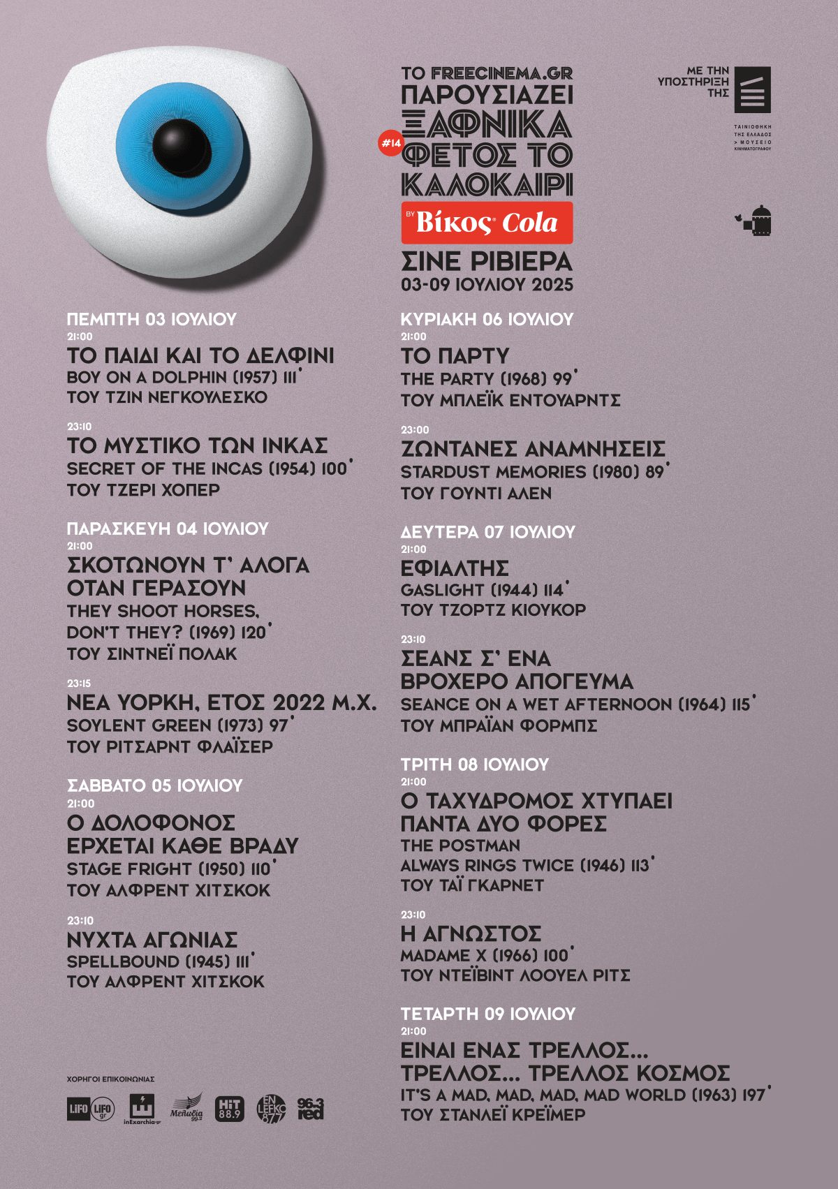 Από τις 3 έως και τις 9 Ιουλίου, το κοινό της Αθήνας θα έχει την ευκαιρία να απολαύσει κλασικά αριστουργήματα και ψυχαγωγικά χολιγουντιανά φιλμ που έχουμε λατρέψει, όπως "Το παιδί και το δελφίνι" με τη θρυλική Σοφία Λόρεν, το "Ο δολοφόνος έρχεται κάθε βράδυ" του Άλφρεντ Χίτσκοκ, το ξεκαρδιστικό "Πάρτυ" με τον Πίτερ Σέλερς, τον "Εφιάλτη" με την οσκαρική ερμηνεία της Ίνγκριντ Μπέργκμαν, τις σατιρικές "Ζωντανές αναμνήσεις" του Γούντι Άλεν και πολλά ακόμη, κάτω από τον καλοκαιρινό ουρανό της πόλης. Και φέτος, η Βίκος Cola θα είναι εκεί, προσφέροντας τη δροσιά και τη γεύση που συνοδεύει ιδανικά κάθε προβολή. Η Βίκος Cola, με αμείωτη δίψα για τέχνη και αυθεντική ψυχαγωγία, είναι η παρέα που δεν λείπει ποτέ από τις πιο ξεχωριστές στιγμές της πόλης! Δίνει τον παλμό και κάνει κάθε εμπειρία ακόμα πιο απολαυστική. Γιατί όπου υπάρχει δίψα για ψυχαγωγία, υπάρχει και δίψα για Βίκος Cola.