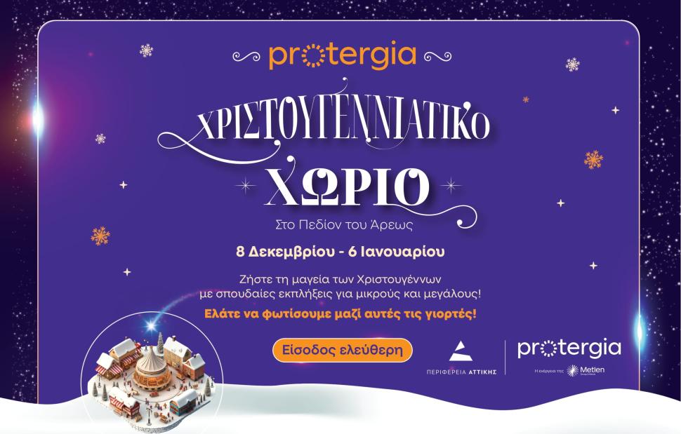 Η Protergia, η ενέργεια της METLEN Energy & Metals, υποστήριξε οριζόντια τη δημιουργία του Χριστουγεννιάτικου Χωριού, σε συνεργασία με την Περιφέρεια Αττικής, η οποία έχει αναλάβει τη διοργάνωση. Από τη φωτισμένη πύλη και τον λαμπερό διάδρομο μέχρι τα εκπαιδευτικά εργαστήρια και το επιβλητικό stage, κάθε σημείο του Χωριού φέρει τη σφραγίδα της Protergia, προσφέροντας στους επισκέπτες μια αξέχαστη εμπειρία.