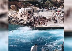 Kατά τον απόπλου δεκάδες νεαρά άτομα του νησιού βουτούν από την προβλήτα μέσα στη θάλασσα και παίζουν με τα απόνερα του θέλοντας για να αποχαιρετίσουν...