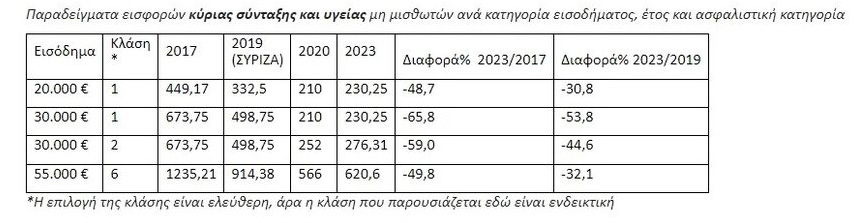 Όπως επισημαίνει το υπουργείο Εργασίας ένας ελεύθερος επαγγελματίας με ετήσιο εισόδημα 20.000 ευρώ, ο οποίος με το νόμο Κατρούγκαλου πλήρωσε αρχικά 449 ευρώ τον μήνα και με τον νόμο 4670/2020 (νόμος Βρούτση) για την κατώτερη ασφαλιστική κατηγορία πλήρωνε 210 ευρώ, από τώρα και στο εξής θα πληρώνει 230 ευρώ. Αντίστοιχα ένας ελεύθερος επαγγελματίας με εισόδημα 30.000 ευρώ, ο οποίος με το νόμο Κατρούγκαλου πλήρωνε αρχικά 674 ευρώ και με το νόμο Βρούτση περιόρισε τις εισφορές του μόνο στα 210 ευρώ, τώρα θα πληρώνει επίσης 230 ευρώ. Σημειώνεται ότι την κατώτερη ασφαλιστική κατηγορία έχει επιλέξει πάνω από το 80% των ελευθέρων επαγγελματιών.