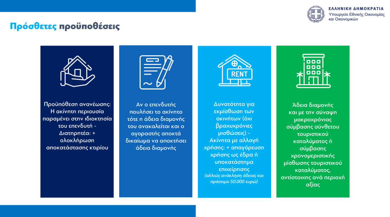 Στις υπόλοιπες περιοχές η αξία που θα πρέπει να καταβάλει ο επενδυτής για την απόκτηση ακίνητης περιουσίας ανέρχεται στις 400.000 ευρώ και 250.000 ευρώ για διατηρητέα.