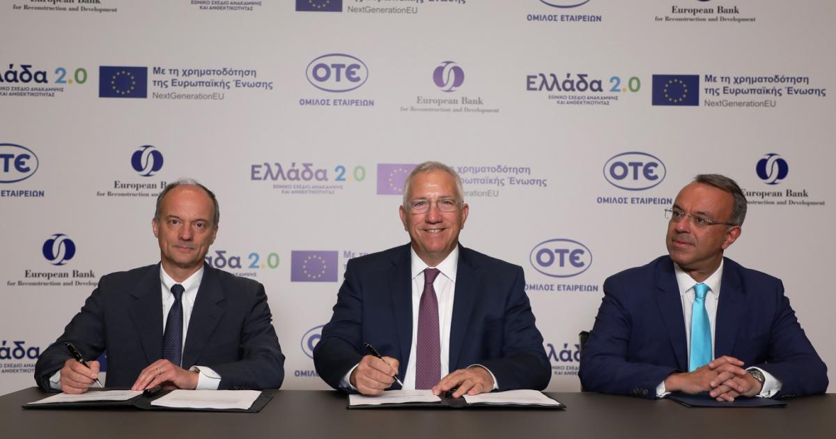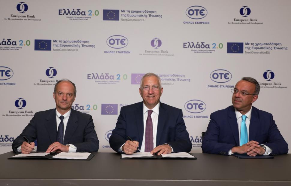 Οι πόροι αυτοί θα συμβάλουν στην ανάπτυξη δικτύου Fiber to the Home (FTTH) στην ελληνική περιφέρεια από τον ΟΤΕ, στο πλαίσιο του επενδυτικού του πλάνου ύψους άνω των €3 δισ. έως το 2027. Η υπογραφή της συμφωνίας έγινε στο Διοικητικό Μέγαρο του Ομίλου ΟΤΕ, μεταξύ του Dirk Werner (Director, Head of Telecommunications, Media and Technology – EBRD) και του Προέδρου και Διευθύνοντος Συμβούλου του Ομίλου ΟΤΕ, κ. Μιχάλη Τσαμάζ, παρουσία του Υπουργού Οικονομικών κ. Χρήστου Σταϊκούρα, του Αναπληρωτή Υπουργού Οικονομικών κ. Θόδωρου Σκυλακάκη και του Διοικητή της Ειδικής Υπηρεσίας Συντονισμού του Ταμείου Ανάκαμψης κ. Νίκου Μαντζούφα.