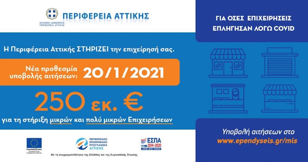 Λόγω του μεγάλου ενδιαφέροντος που έχει ήδη εκδηλωθεί από χιλιάδες ενδιαφερόμενους , κρίθηκε σκόπιμο να παραταθεί ως τις 20 Ιανουαρίου 2021, η προθεσμία υποβολής των αιτήσεων συμμετοχής στο συγκεκριμένο πρόγραμμα της Περιφέρειας Αττικής.
