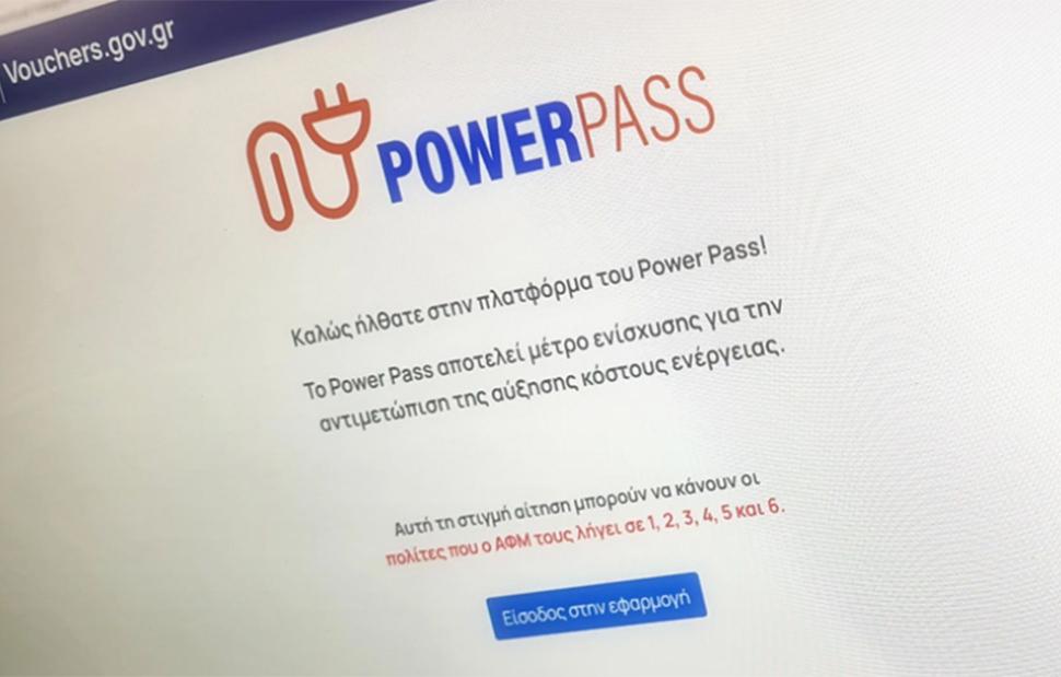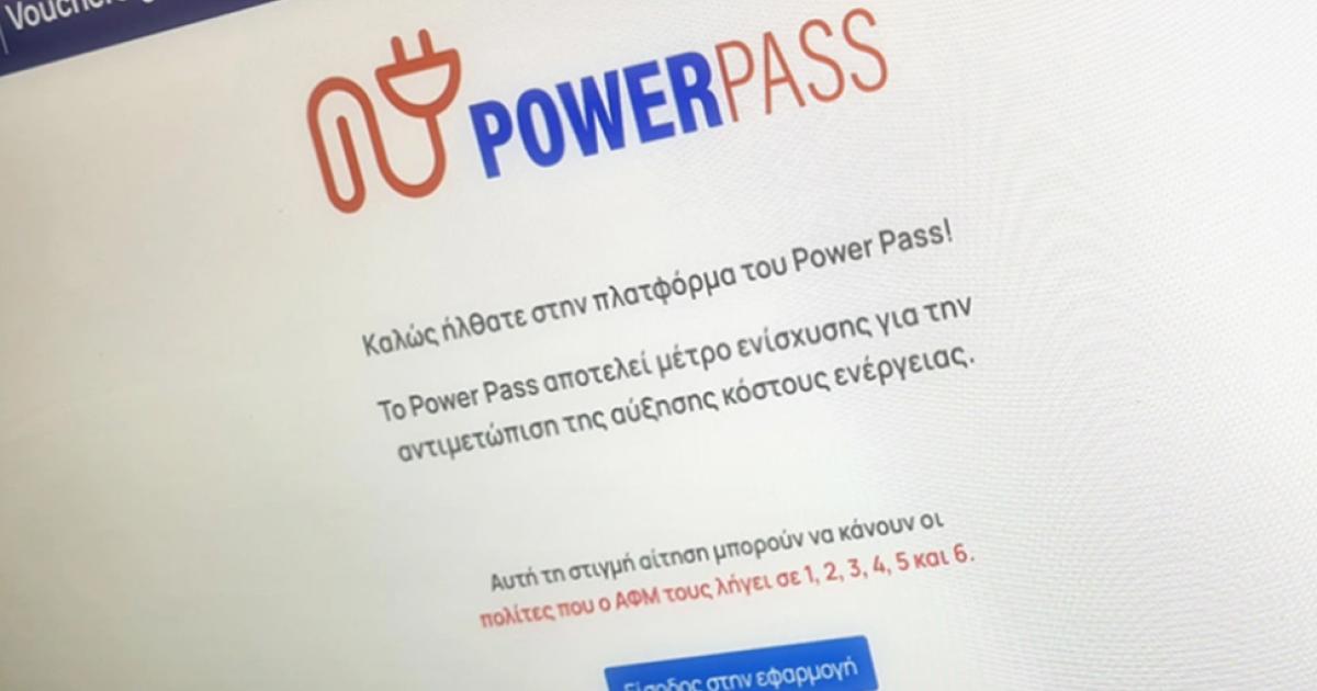 Το Power Pass είναι πλατφόρμα που είχε εξαγγείλει ο Πρωθυπουργός Κυριάκος Μητσοτάκης για την οικονομική ενίσχυση οικιακών καταναλωτών ηλεκτρικού ρεύματος. Η επιδότηση αφορά στους λογαριασμούς ρεύματος πρώτης κατοικίας ή φοιτητικής στέγης εντός Ελλάδος, που εκδόθηκαν κατά το διάστημα από 01-12-2021 έως και 31-05-2022 και, ανάλογα με το ύψος των λογαριασμών, μπορεί να ανέλθει μέχρι και στο ποσό των 600€.