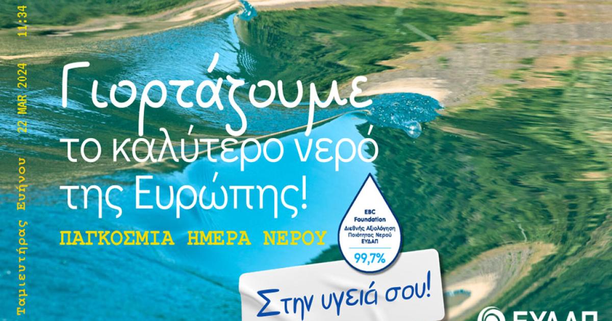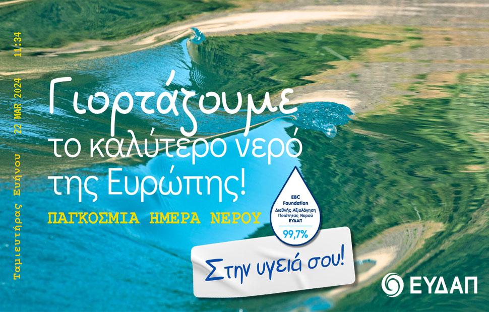 Με απώτερο στόχο, μέσα από συνεχείς επενδύσεις σε έργα υποδομής, τη στοχευμένη μετάβαση σε καινοτόμες εφαρμογές και την αποτελεσματική διαχείριση των διαθέσιμων πόρων, να συνεχίσει να προσφέρει άριστης ποιότητας νερό, προσβάσιμο σε όλους, εστιάζοντας παράλληλα στην επίτευξη μιας ισορροπημένης και αειφόρου ανάπτυξης. Γιαυτό κάθε χρόνο, στις 22 Μαρτίου έχουμε κάθε λόγο να γιορτάζουμε το ποιοτικότερο νερό της Ευρώπης!