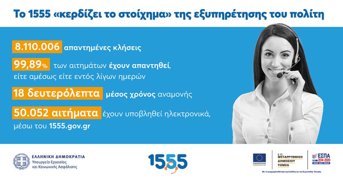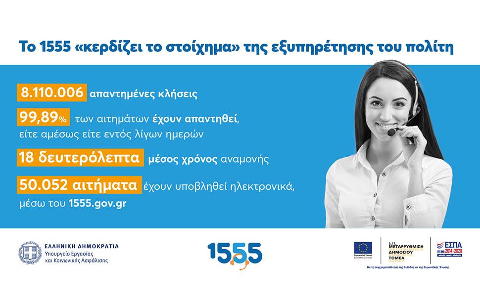 Έχοντας αντιμετωπίσει αποτελεσματικά το χάος των κατεβασμένων τηλεφώνων, τις πολύωρες αναμονές και την ταλαιπωρία, το 1555 του Υπουργείου Εργασίας και Κοινωνικής Ασφάλισης εξυπηρετεί σήμερα ένα μέσο όρο 14.000 κλήσεων την ημέρα, άμεσα, φιλικά και αξιόπιστα.