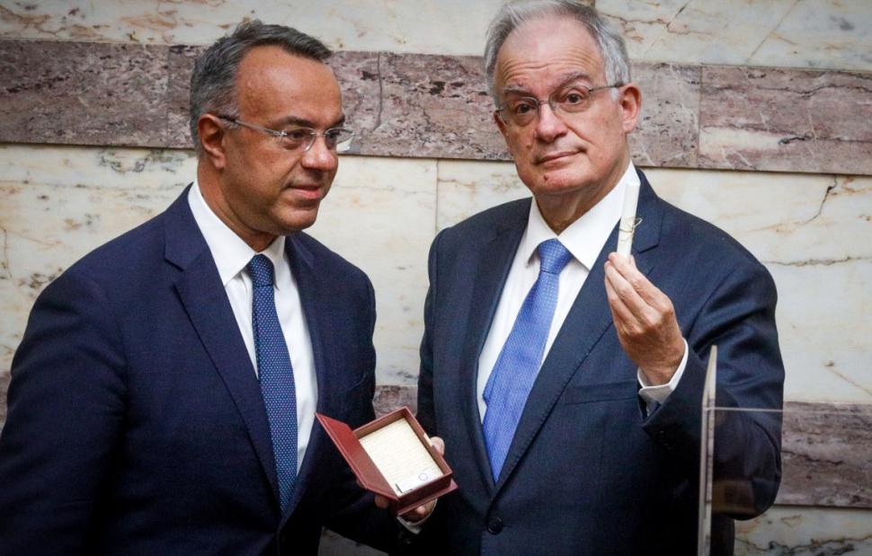 Κατά την έναρξη της συνεδρίασης της Ολομέλειας του Κοινοβουλίου, ο Χρήστος Σταϊκούρας παρέδωσε στον Πρόεδρο της Βουλής, Κωνσταντίνο Τασούλα, τον κρατικό προϋπολογισμό σε ηλεκτρονική μορφή.