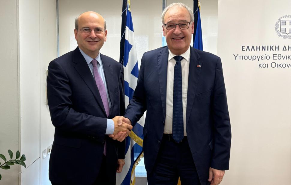 Με τον ομοσπονδιακό καγκελάριο για Οικονομικές Υποθέσεις, Εκπαίδευση και Έρευνα της Ελβετίας, Guy Parmelin, συναντήθηκε την Παρασκευή στην Αθήνα. Ο υπουργός Εθνικής Οικονομίας και Οικονομικών Κωστής Χατζηδάκης.