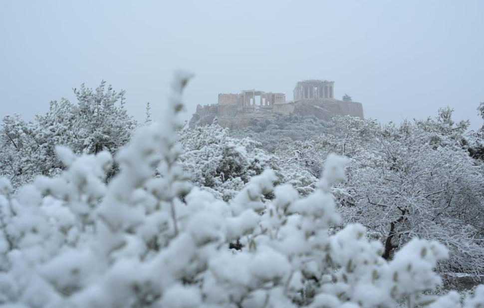 Heavy snowfall and plummeting temperatures shut schools and shops in the Greek capital on Monday, with many public services and businesses switching to remote working.
