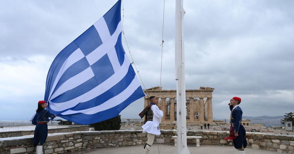 Στις 08:00 το πρωί, πραγματοποιήθηκε η επίσημη έπαρση της ελληνικής σημαίας στον Ιερό Βράχο της Ακρόπολης, σηματοδοτώντας την έναρξη των εορτασμών της 25ης Μαρτίου.