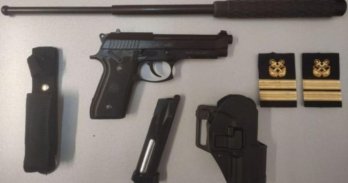 Εντός σκάφους, στο οποίο διέμενε, βρέθηκε μία πλαστική θήκη μέσης πιστολιού και, κάτω από το σακάκι του, φορούσε λευκό πουκάμισο με επωμίδες, με τον βαθμό του ανθυποπλοιάρχου Λιμενικού.