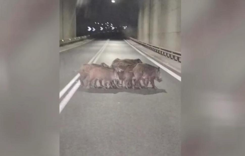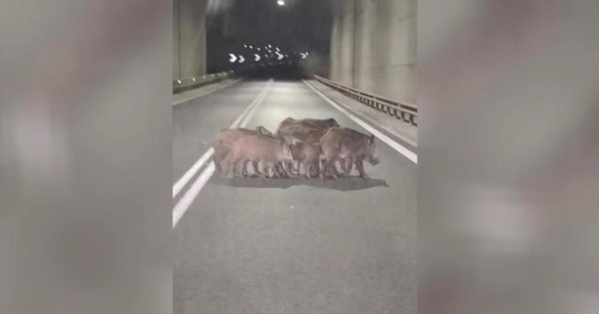 Σε βίντεο του onlarissa.gr, ο οδηγός του οχήματος που κινούνταν στην παλιά εθνική οδό πρόλαβε και σταμάτησε, βλέποντας ξαφνικά μπροστά του μία αγέλη αγριογούρουνων.