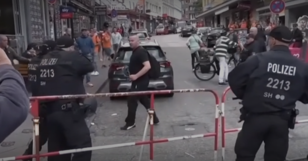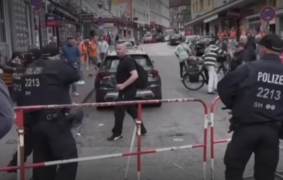Ένας άνδρας, ο οποίος κρατούσε τσεκούρι και εκρηκτικά, επιτέθηκε ουρλιάζοντας νωρίτερα σήμερα (16/6) σε φιλάθλους που ήταν συγκεντρωμένοι στην περιοχή Ρέεπερμπαν του Αμβούργου. Η αστυνομία τον ακινητοποίησε τελικά τραυματίζοντάς τον στο πόδι.