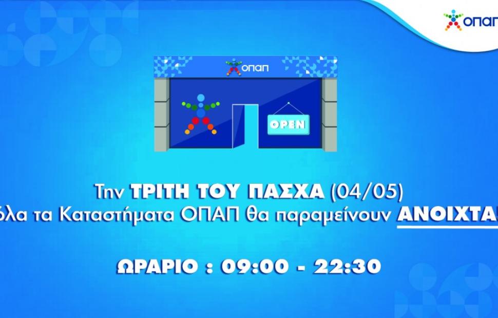 Συγκεκριμένα, αύριο, όπως και κάθε μέρα, τα καταστήματα ΟΠΑΠ θα είναι ανοιχτά από τις 9:00 έως τις 22:30, προσφέροντας τα παιχνίδια της εταιρείας και διευκολύνοντας το κοινό στην πληρωμή λογαριασμών.