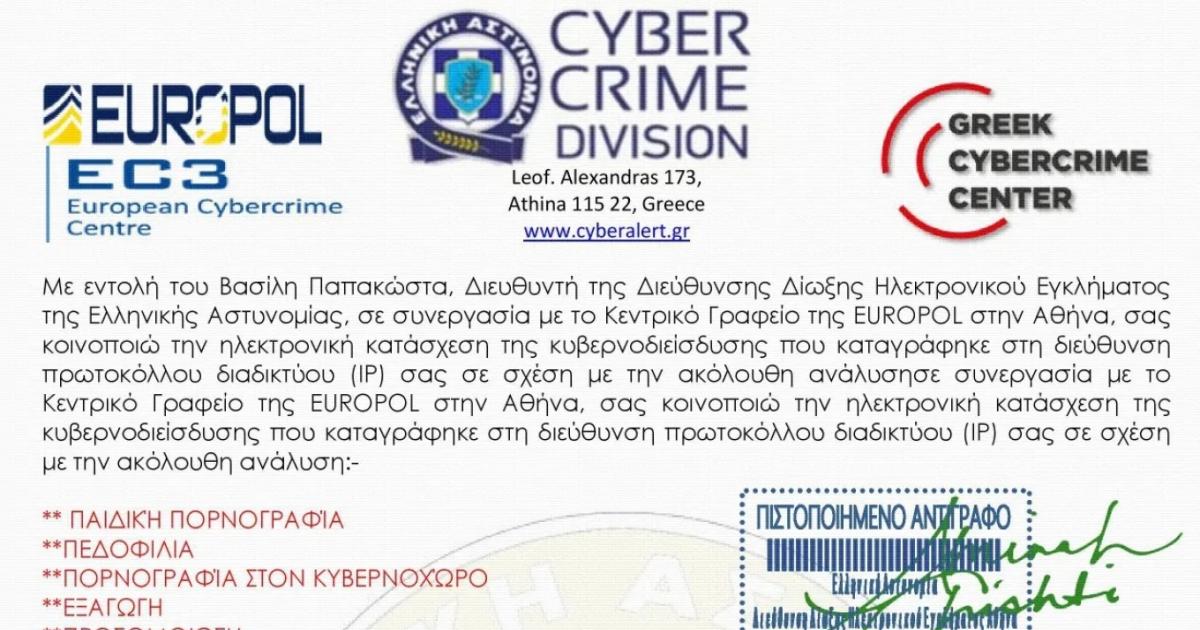 Στην προσπάθειά τους να προσδώσουν «αληθοφάνεια» στη σχετική επιστολή χρησιμοποιούν τα λογότυπα της Ελληνικής Αστυνομίας και της Europol και εντύπωμα στρογγυλής σφραγίδας με δήθεν υπογραφή του διευθυντή της Διεύθυνσης Δίωξης Ηλεκτρονικού Εγκλήματος.