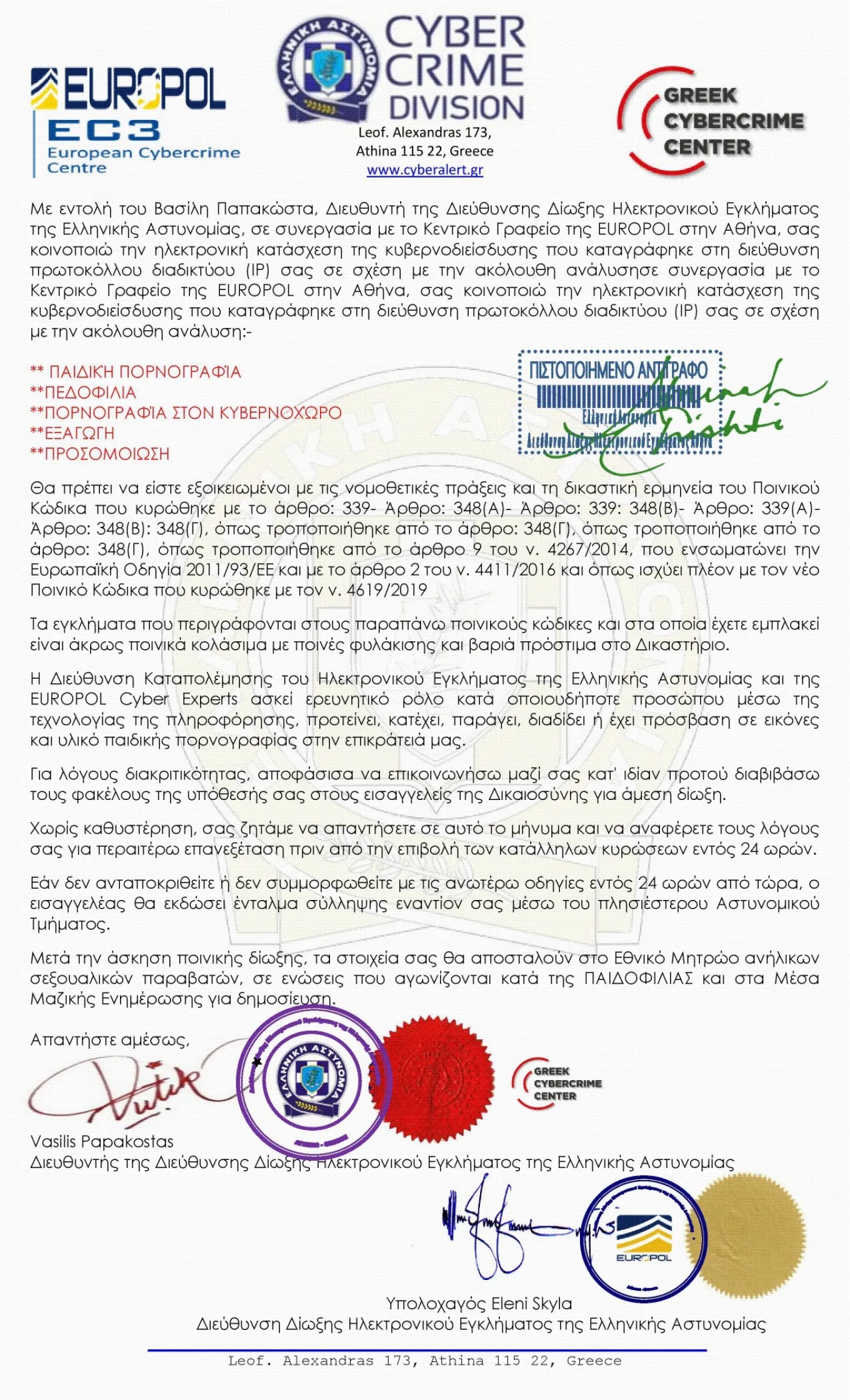 Στο πλαίσιο αυτό ανακοινώνεται ότι, το κείμενο – μήνυμα που διακινείται μέσω ηλεκτρονικού ταχυδρομείου (email), ως δήθεν επιστολή του Διευθυντή της Διεύθυνσης Δίωξης Ηλεκτρονικού Εγκλήματος, η οποία φέρει το ονοματεπώνυμό του, καθώς και ψευδή σφραγίδα με επιγραφή «EUROPOL» και υπογραφή «Υπολοχαγός Eleni Skyla» είναι καταφανώς ψευδεπίγραφο και απατηλό και αποστέλλεται από δράστες που επιχειρούν προφανώς να εξαπατήσουν – παραπλανήσουν τους πολίτες και ακολούθως να αποκομίσουν παράνομο οικονομικό όφελος.
