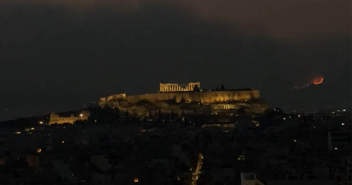Το βίντεο που κυκλοφόρησε στα social media είναι του επικεφαλής φωτογράφου του Γαλλικού Πρακτορείου Ειδήσεων στην Αθήνα και δείχνει την απόκοσμη εικόνα της Ακρόπολης να έχει γύρω της μαύρους καπνούς και τη φωτιά στο φόντο να κατακαίει την Πάρνηθα ενώ πέφτει η νύχτα.