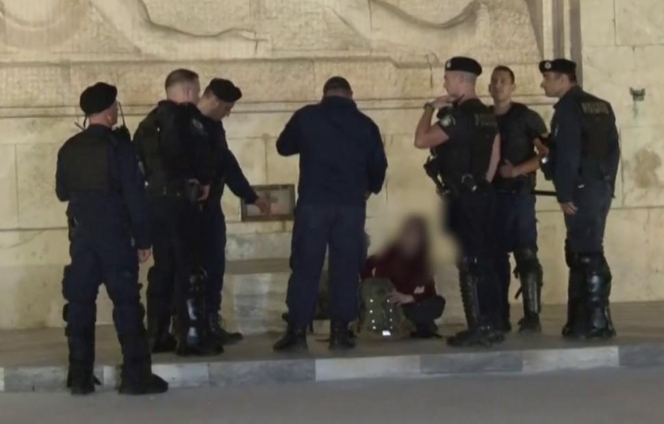 Αστυνομικοί πλησίασαν για να την απομακρύνουν, αλλά αυτή αντιδρούσε. Τελικά την απομάκρυναν και την έβαλαν σε περιπολικό.