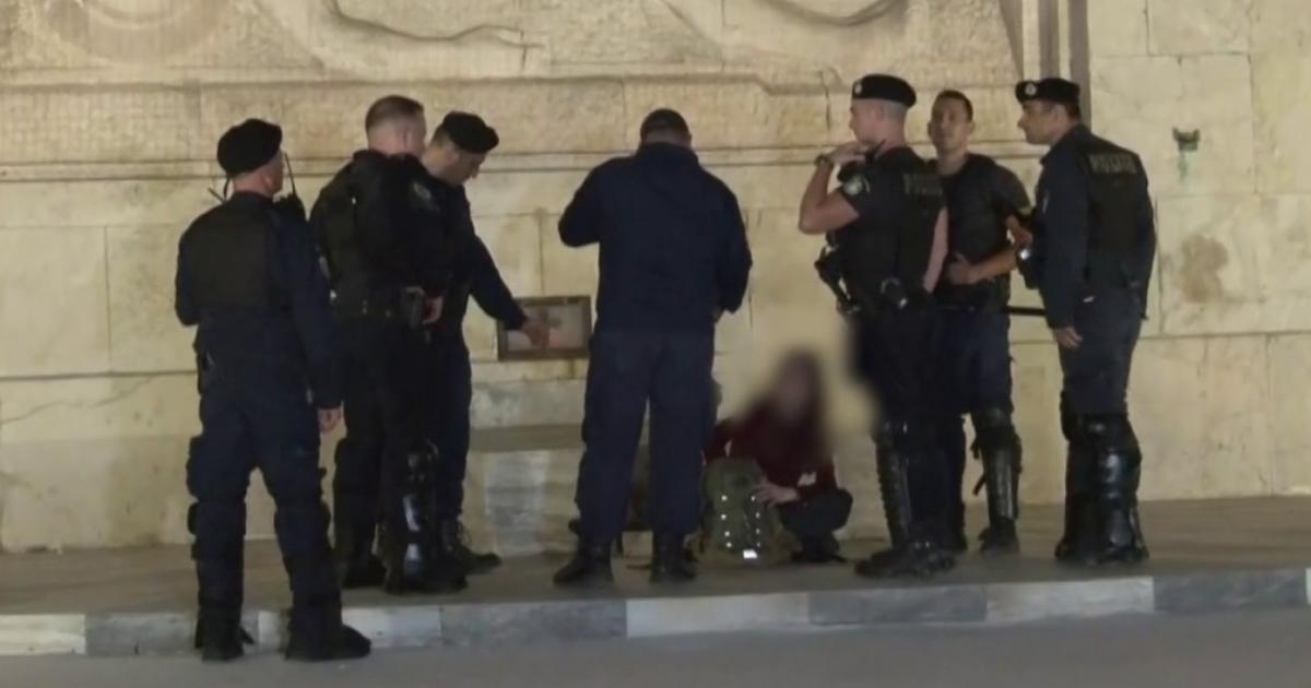 Αστυνομικοί επενέβησαν την Κυριακή για να απομακρύνουν μία γυναίκα που είχε καθίσει πάνω στο Μνημείο του Αγνώστου Στρατιώτη.