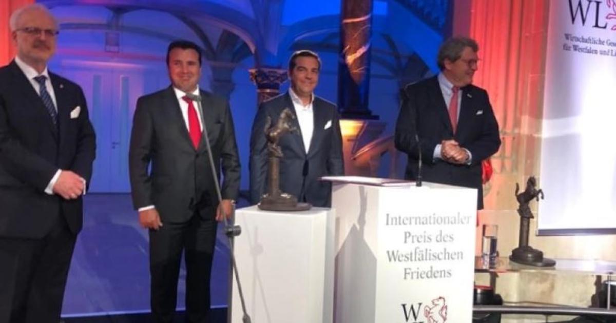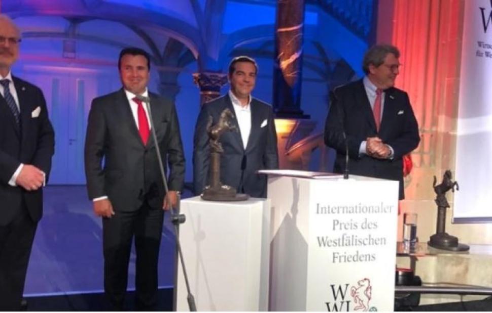 «Στόχος της Συμφωνίας των Πρεσπών ήταν να ριζώσει βαθειά στις συνειδήσεις των λαών μας και στις σχέσεις των χωρών μας», ανέφερε ο πρόεδρος του ΣΥΡΙΖΑ, Αλέξης Τσίπρας κατά την τελετή ανάληψης του βραβείου Βεστφαλίας, από κοινού με τον πρωθυπουργό της Βόρειας Μακεδονίας, Ζόραν Ζάεφ.