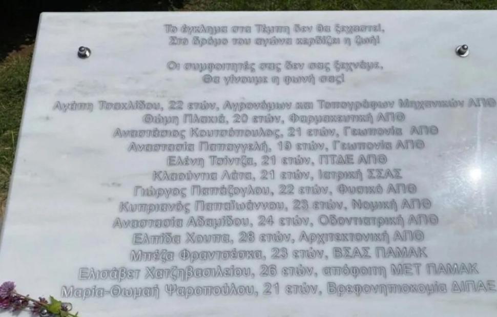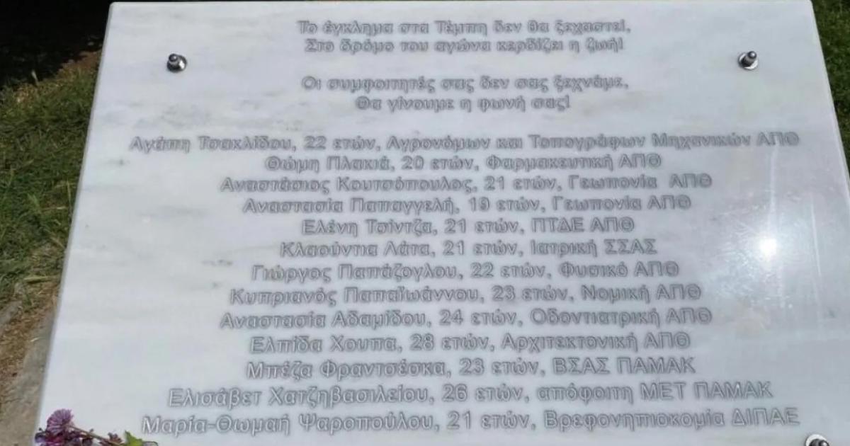 Τα αποκαλυπτήρια του μνημείου στο οποίο είναι γραμμένα τα ονόματα των φοιτητών που σκοτώθηκαν στο σιδηροδρομικό δυστύχημα έκαναν μέλη φοιτητικών συλλόγων τονίζοντας ότι «δύο μήνες μετά το προδιαγεγραμμένο έγκλημα στα Τέμπη οι συμφοιτητές σας δεν σας ξεχνάμε».