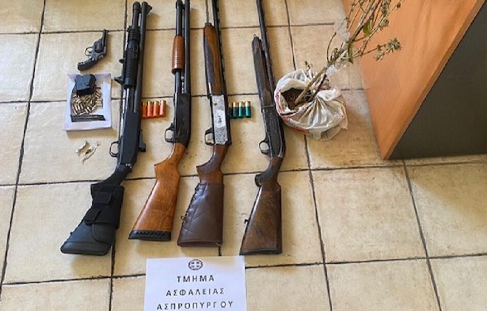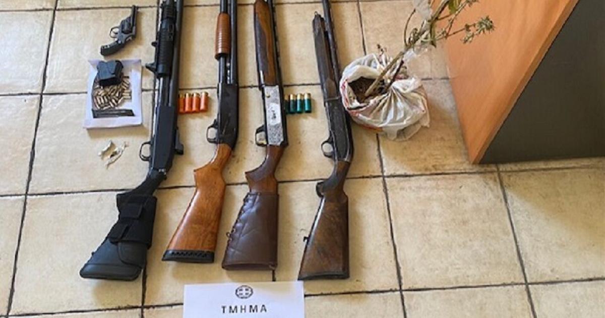 Παράλληλα, πραγματοποιήθηκαν έρευνες σε τέσσερα σπίτια και κατασχέθηκαν: Τέσσερις καραμπίνες, περίστροφο, γεμιστήρας, 41 φυσίγγια διαφόρων διαμετρημάτων, ποσότητα κάνναβης βάρους 1,7 γραμμαρίου και ένα δενδρύλλιο κάνναβης.