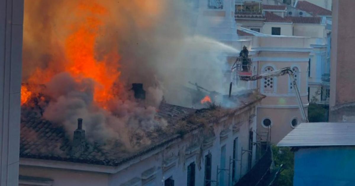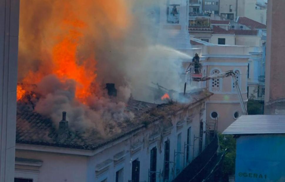 Οι φλόγες έχουν «τυλίξει» τη σκεπή του κτιρίου, ενώ η φωτιά έχει εκδηλωθεί κοντά στην εκκλησία της Αγίας Ειρήνης.