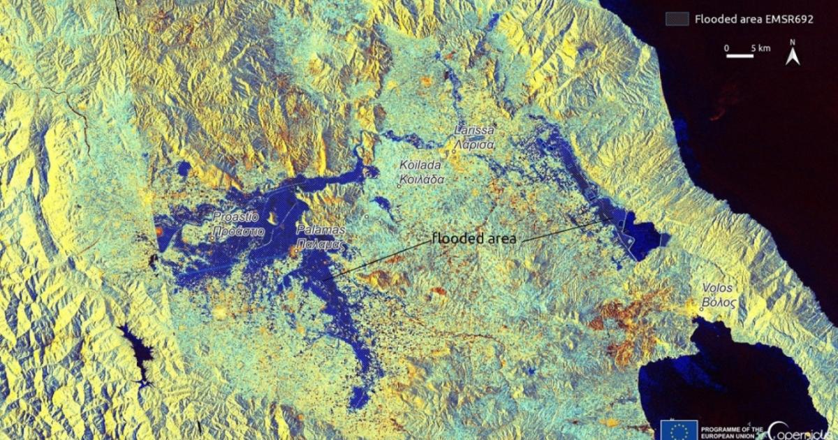 Δορυφορική φωτογραφία από το Sentinel 1 που δείχνει τις πλημμυρισμένες περιοχές στη Θεσσαλία δημοσίευσε το Copernicus στο Twitter.