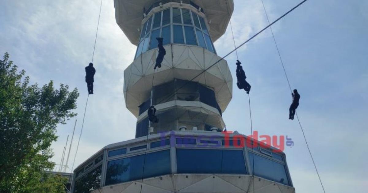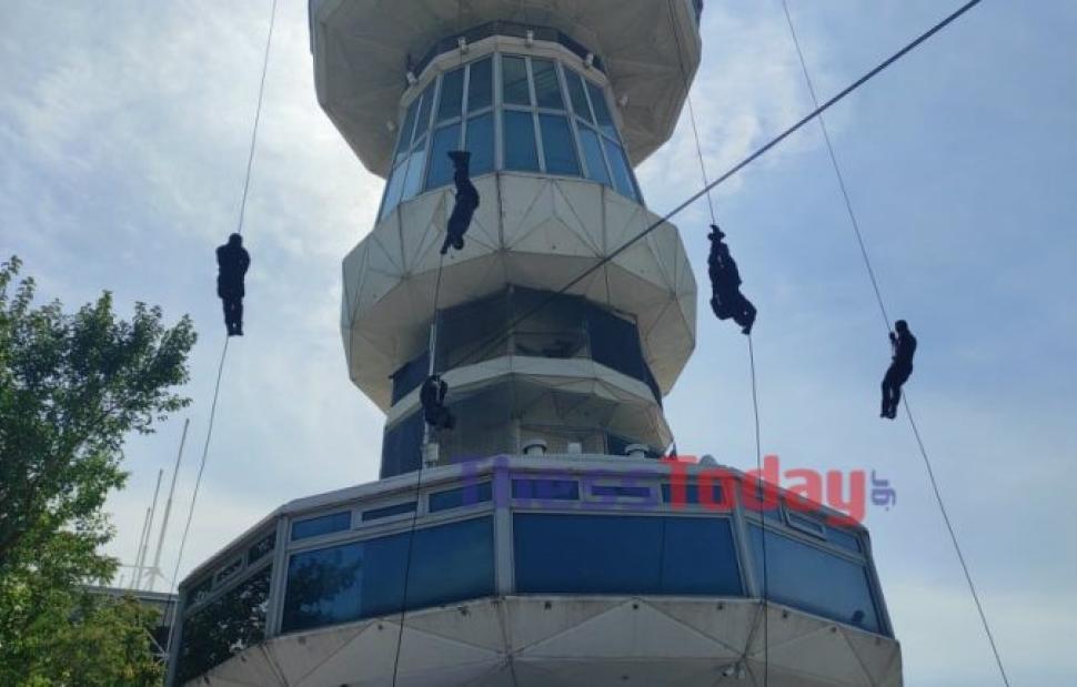 Eντυπωσιακή επίδειξη καταρρίχησης πραγματοποίησε ειδικά εκπαιδευμένη ομάδα της ΕΚΑΜ από τον πύργο του ΟΤΕ, κατά τη διάρκεια της βόλτας του Κυριάκου Μητσοτάκη στους χώρους της ΔΕΘ.