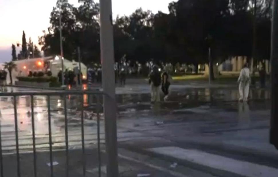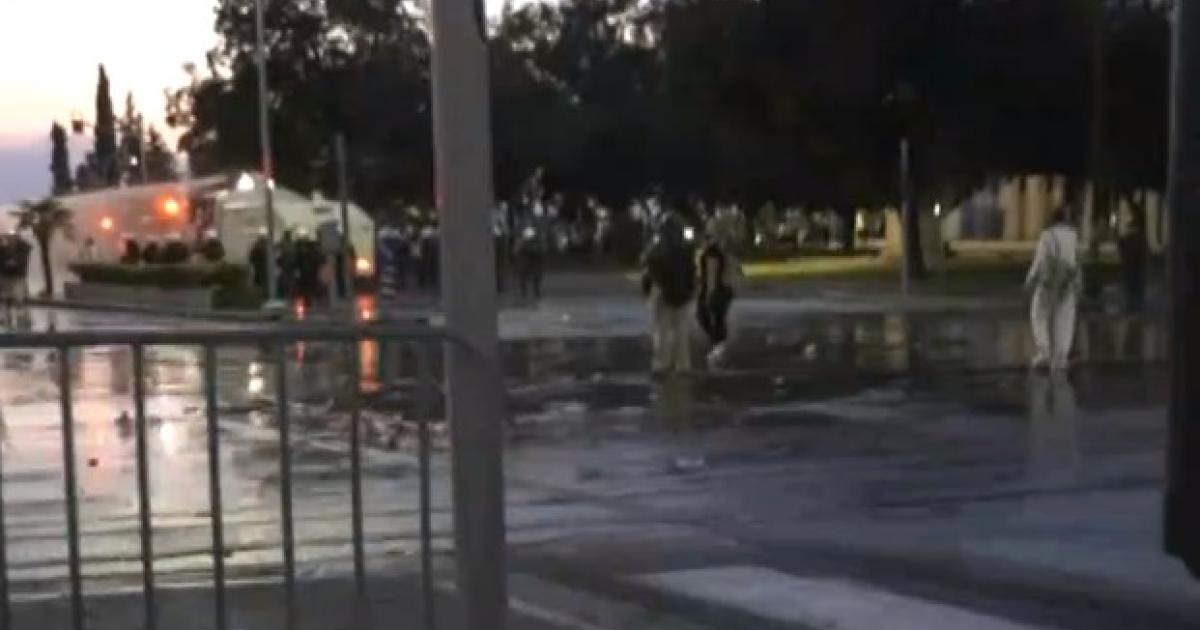 Σύμφωνα με πληροφορίες, ομάδα αντιεμβολιαστών επιτέθηκε με πέτρες και μολότοφ στις αστυνομικές δυνάμεις, με τις τελευταίες να απαντούν κάνοντας ρίψη δακρυγόνων και νερού από τους «Αίαντες».