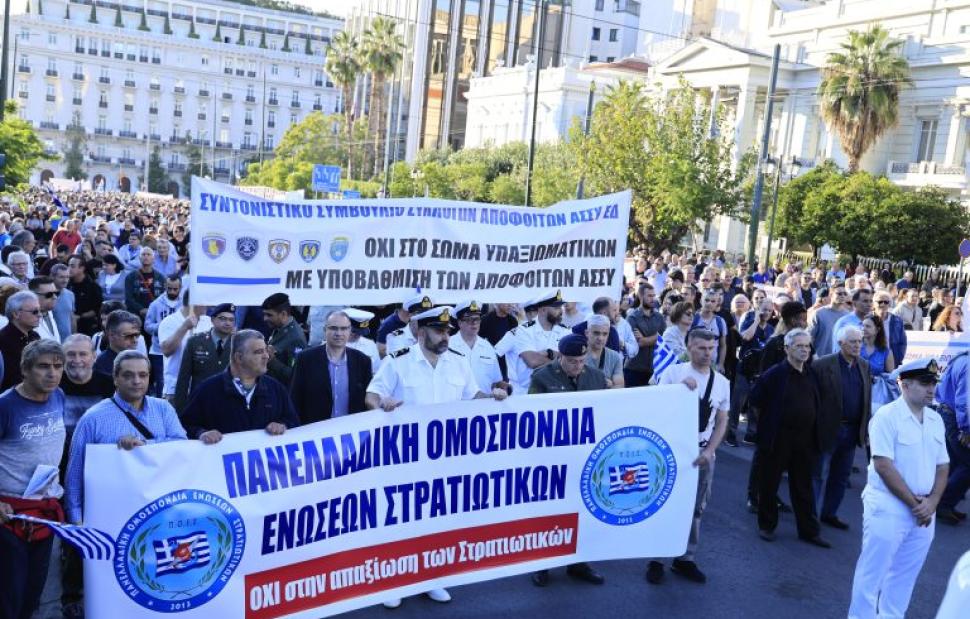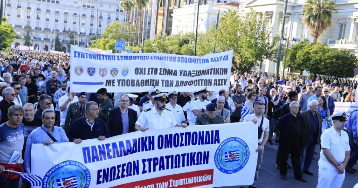 Έχουν ενώσει τη φωνή τους στη συγκέντρωση διαμαρτυρίας, η οποία ξεκίνησε από την παλιά Βουλή, δηλώνουν την αντίθεσή τους στο νομοσχέδιο που οδηγεί, όπως αναφέρουν, στη βαθμολογική τους υποβάθμιση, στη βαθμολογική τους εξέλιξη, κατά έξι βαθμούς αξιωματικού με καταληκτικό βαθμό αυτό του ανθυπασπιστή.