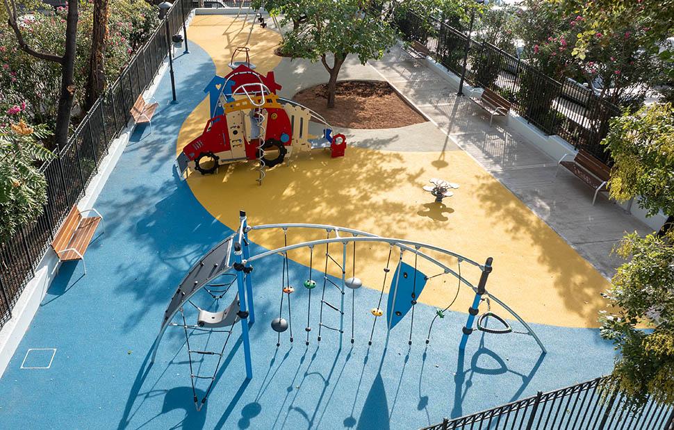 Στις δύο παιδικές χαρές, πραγματοποιήθηκαν εργασίες αποξήλωσης και αντικατάστασης παλαιών οργάνων και δαπέδων ασφαλείας, ενώ τοποθετήθηκε καινούργιος αστικός εξοπλισμός. Για τις παρεμβάσεις, αξιοποιήθηκαν υλικά από το Visa Olympic Games Park που δημιουργήθηκε στο The Ellinikon Experience Park με αφορμή τη χορηγία της Visa προς τους Ολυμπιακούς και Παραολυμπιακούς Αγώνες - Παρίσι 2024.