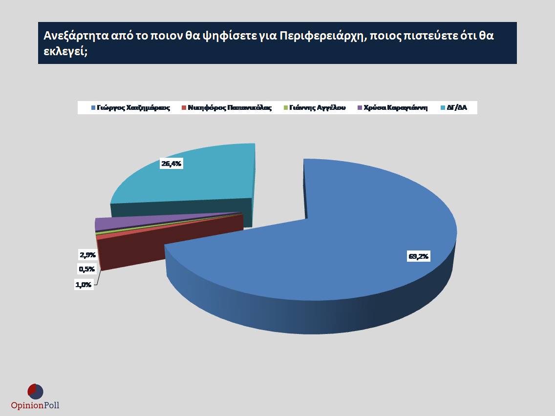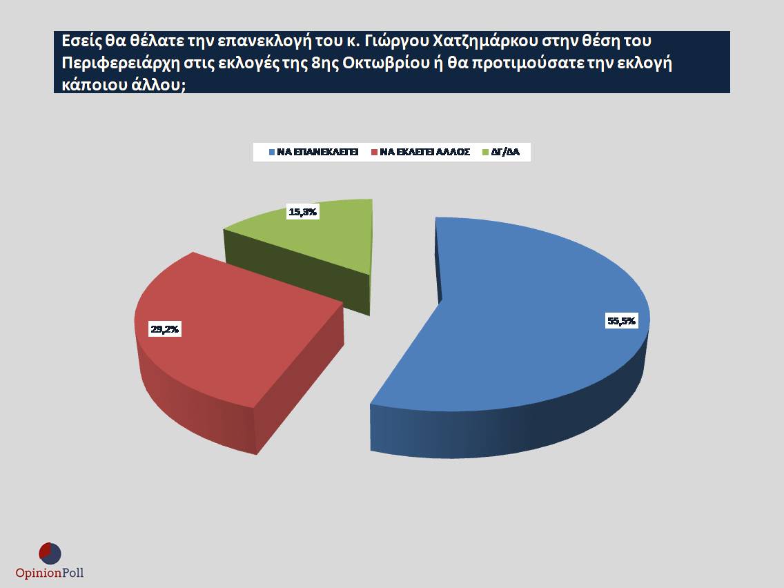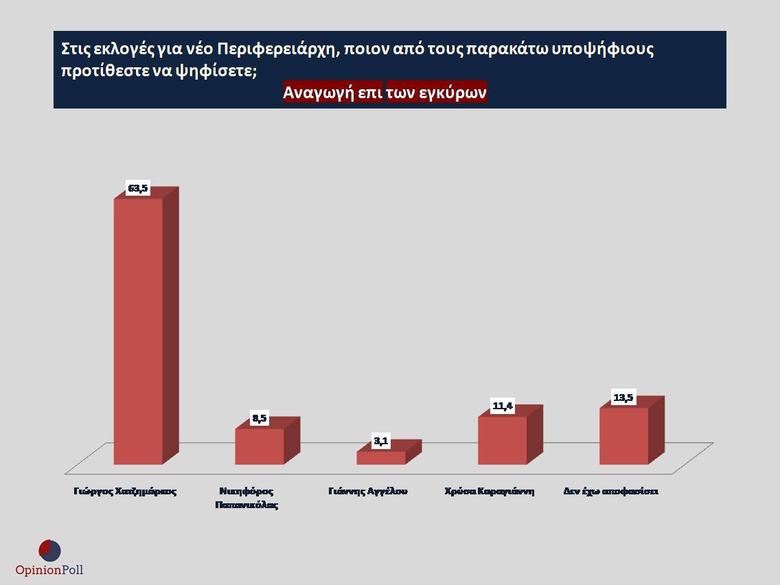 Σύμφωνα με την Opinion Poll ο Γιώργος Χατζημάρκος εκλέγεται από την πρώτη Κυριακή (8/10/2023) Περιφερειάρχης με ποσοστό άνω του 63,5% και με διαφορά από την δεύτερη Χρύσα Καραγιάννη άνω των 50 ποσοστιαίων μονάδων.