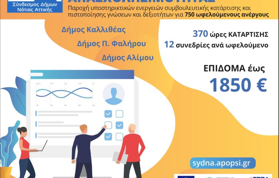 Ο Σύνδεσμος Δήμων Νότιας Αττικής (Συ.Δ.Ν.Α) και ο Δήμαρχος Καλλιθέας διοργανώνουν την Ημερίδα ενημέρωσης της τοπικής κοινωνίας για το έργο «Δράσεις για την Βελτίωση της Απασχολησιμότητας» που αφορούν στην επιδοτούμενη κατάρτιση 750 ανέργων.
