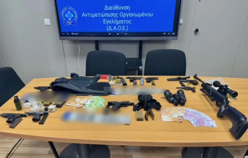 Συγκεκριμένα, κατασχέθηκαν, μεταξύ άλλων, έξι πιστόλια, περίστροφο, αεροβόλο τυφέκιο, τρεις γεμιστήρες, 485 φυσίγγια διαφόρων διαμετρημάτων, σιγαστήρας πυροβόλου όπλου, χειροβομβίδα κρότου λάμψης, τσεκούρι, μαχαίρι, δύο αυτοσχέδιες νάιλον συσκευασίες που περιείχαν κοκαΐνη συνολικού μεικτού βάρους 14,5 γραμμαρίων, τρεις συσκευές γεωεντοπισμού (gps tracker), 65 χρυσές λίρες και το χρηματικό ποσό των 100.725 ευρώ.