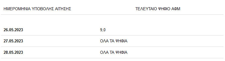Υπενθυμίζεται πως η πλατφόρμα ανοίγει ανάλογα με το τελευταίο ψηφίο του ΑΦΜ των ενδιαφερόμενων δικαιούχων έως τις 28.05.2023 και ώρα 23:59, ως εξής: