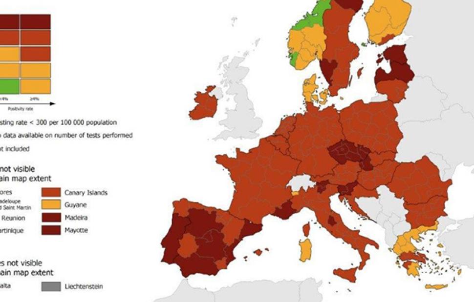 Τα νούμερα συνεχίζουν μάλιστα να μην είναι τόσο καλά για την υπόλοιπη Ευρώπη, καθώς αρκετά κράτη όπως η Πορτογαλία και μέρος της Γαλλίας και της Ιταλίας παραμένουν στο σκούρο κόκκινο χρώμα.